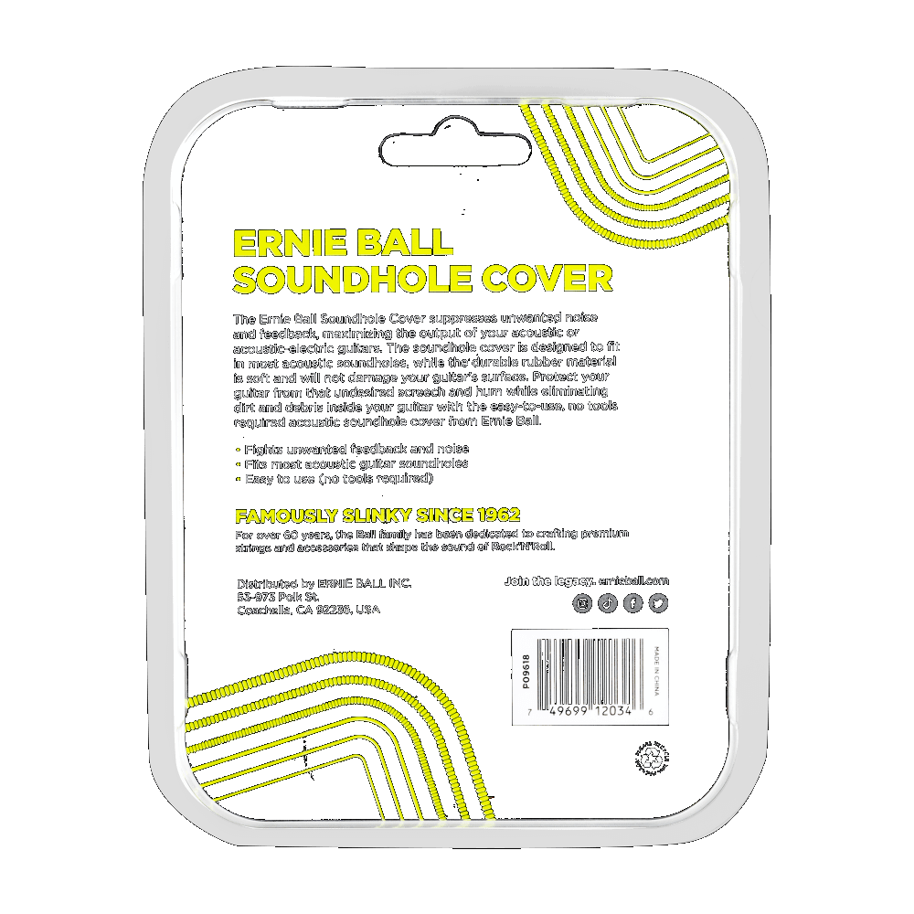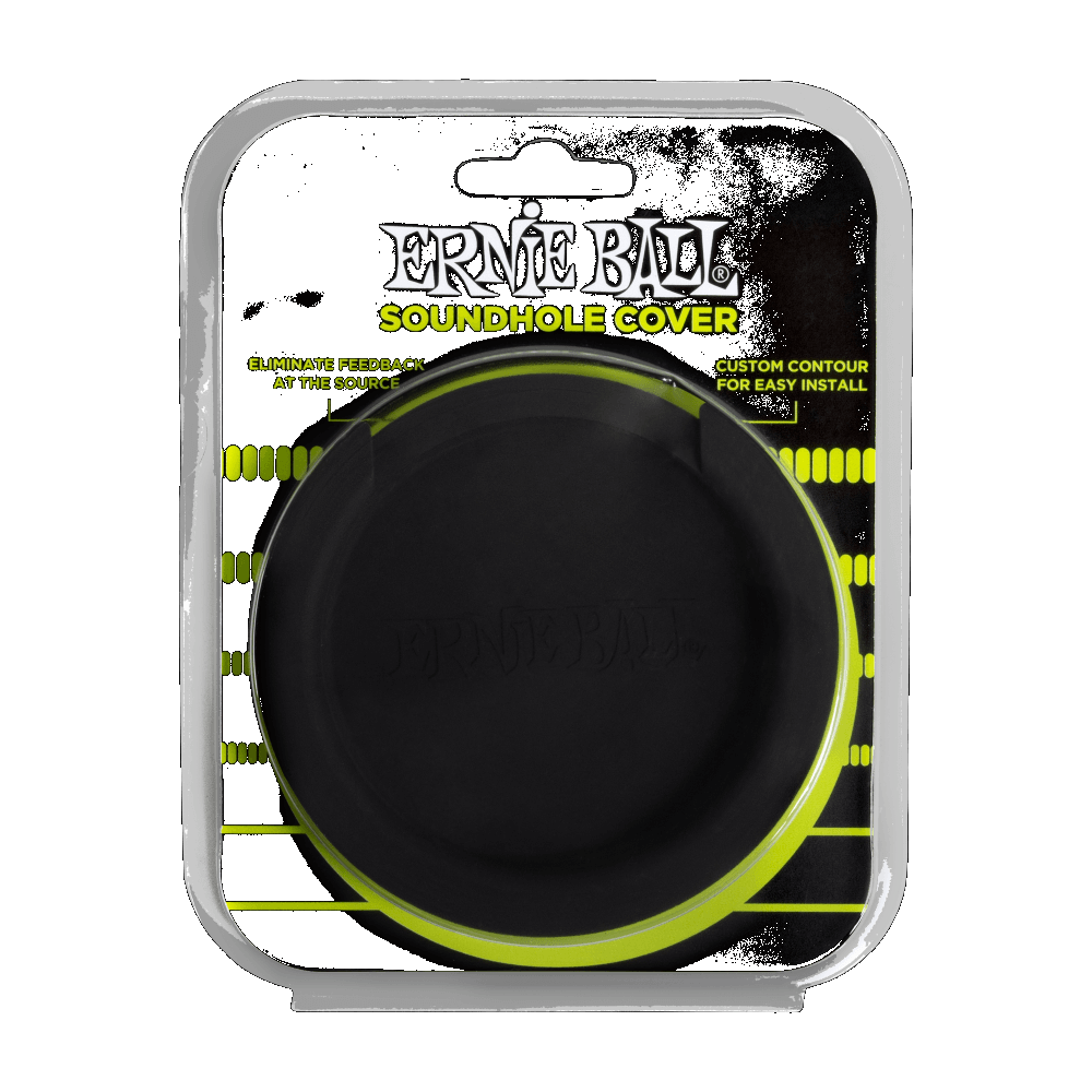The Ernie Ball Soundhole Cover suppresses unwanted noise and feedback, maximizing the output of your acoustic-electric guitars. The soundhole cover is designed to fit in most acoustic soundholes, while the durable rubber material is soft and will not damage your guitar’s surface. Protect your guitar from that undesired screech and hum while eliminating dirt and debris inside your guitar with the easy-to-install, no tools required acoustic soundhole cover from Ernie Ball!INTENDED FOR FULL SIZE GUITARS WITH APPROXIMATELY 4" (10 cm) SOUND HOLES.