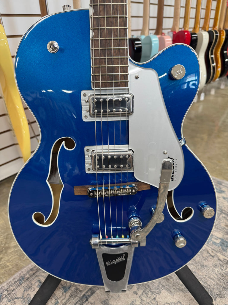 Unleash your inner rockstar with the Gretsch G5420T Electromatic Classic in stunning Azure Metallic. This B Stock guitar combines vintage charm with modern playability, making it a must-have for rock and blues aficionados. Its standout feature, the Bigsby tailpiece, offers smooth tremolo effects, allowing you to create rich, dynamic tones effortlessly. The guitar's classic hollow body design not only looks striking but also enhances sound resonance, delivering that iconic Gretsch tone. Whether you're jamming in your garage or performing on stage, the G5420T ensures every note you play is infused with character and style. Embrace the perfect blend of tradition and innovation with this eye-catching instrument.