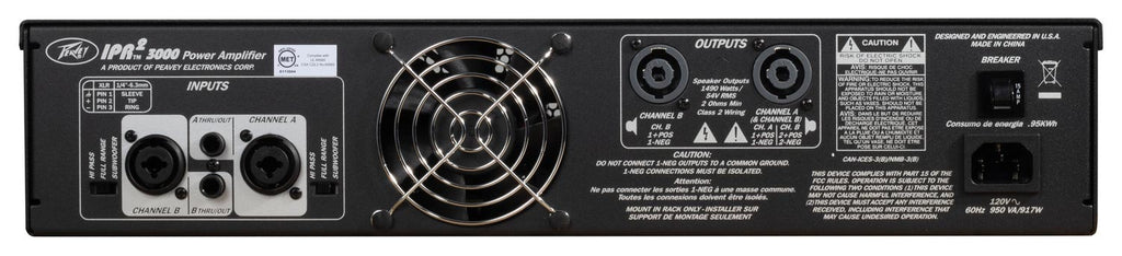 Peavey IPR2 3000 3000watt Lightweight Power AmpIPR2 power amplifiers, designed for years of reliable, flawless operation under rigorous use. The groundbreaking IPR2 series utilizes an advanced design that allows Peavey engineers to dramatically reduce weight while increasing output power, reliability and thermal efficiency. IPR2 Series amplifiers are designed with a resonant switch-mode power supply and a high-speed class D topology that yields the highest audio resolution and efficiency available. This revolutionary amplifier offers the sonic superiority and unsurpassed reliability for which Peavey is famous, in an extremely efficient and lightweight design. Advanced technology and extensive protection circuitry allow operation with greater efficiency into difficult loads and power conditions. The DDT (Distortion Detection Technique) circuitry ensures trouble-free operation into loads as low as 2 ohms. DDT protects drivers and ensures that sonic integrity is maintained, even in extreme overload conditions. The IPR2's high-efficiency design allows the amplifier to operate at very low temperatures, and does not require massive heat sinks to cool.