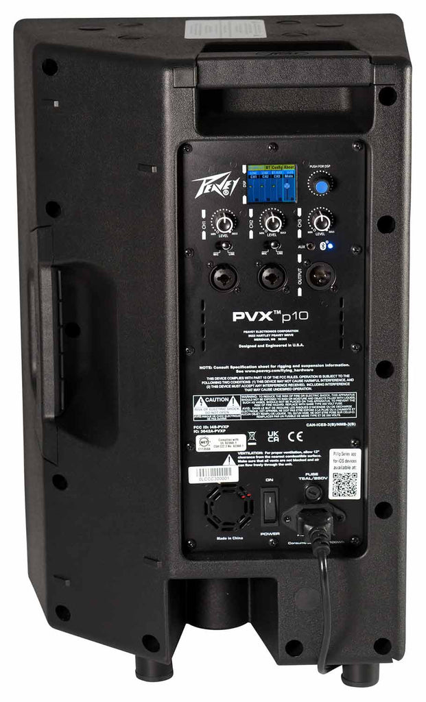 The PVXp10 Bluetooth features a reliable bi-amped power section that provides a total of 520 Watts of peak dynamic power with DSP based compression and limiting. This enclosure features a 10" heavy-duty woofer with a 2 3/8 inch voice coil and 50 ounce magnet, and the RX10 compression driver with a 1 inch titanium diaphragm on a 100 degree horizontal x 60 degree vertical pattern asymmetrical horn. The PVXp10 Bluetooth provides two channels with a balanced input via a combination jack that accepts balanced TRS 1/4" inch input as well as a balanced XLR input. A switch is provided to change between line level gain and mic level gain. A third channel is for a Bluetooth source, or alternatively a 1/8" AUX input jack. Each channel has an adjustable Level control and a three-band EQ section. There is a balanced output, a Male XLR, that can feed the mixed signals from the three channels out to another component. A front baffle LED indicator that can be set to light when power is on, and when the "soft-limiting" DDT circuit is activated, or it can be turned off altogether. The LCD display and EQ presets, along with other DSP operating parameters are accessed via a one-knob selector.