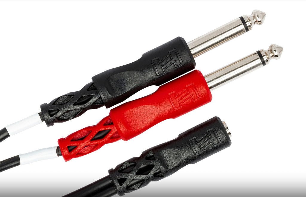 Hosa YMP-434 3.5TRS(F) - Dual 1/4” TS(M) Stereo Breakout CableThis cable is designed to split a stereo signal. Black- and red-coded mono phone plugs indicate left and right respectively. Connectors: 3.5 mm TRSF to Dual 1/4 in TS