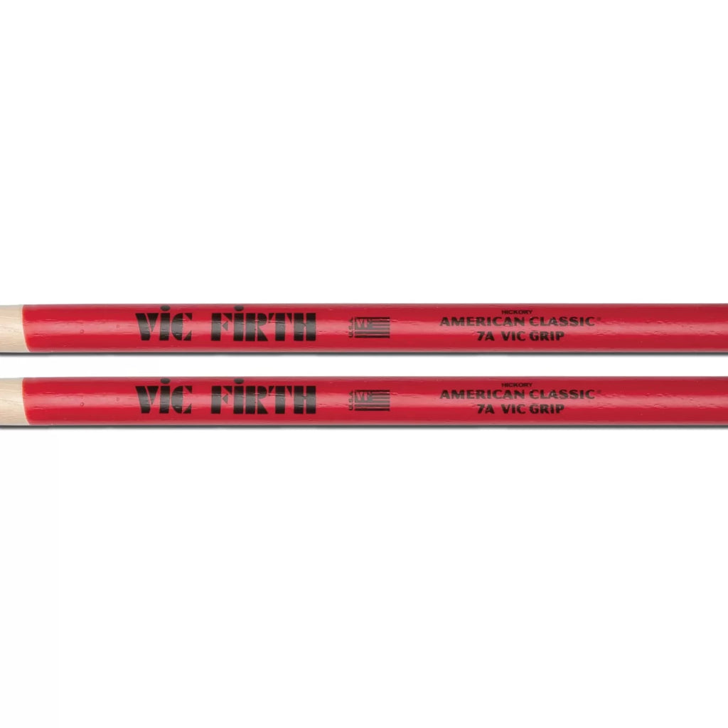 Vic Firth 7AVG 7A Wood Tip Red Vic Grip American Classic DrumsticksDETAILSVic Grip provides an anti-slip finish on our classic 7A design—Diam. - .540"—Length - 15.5"—Taper - Medium—Tip - Tear Drop—Finish - Vic GripSPECS—Diameter : .540" | 1.37cm—Length : 15.5" | 39.37cm—Taper : MediumSTICK—Series : American Classic&174; VicGrip—Surface Coating : Vic GripTIP—Material : Hickory—Tip Shape : Tear Drop