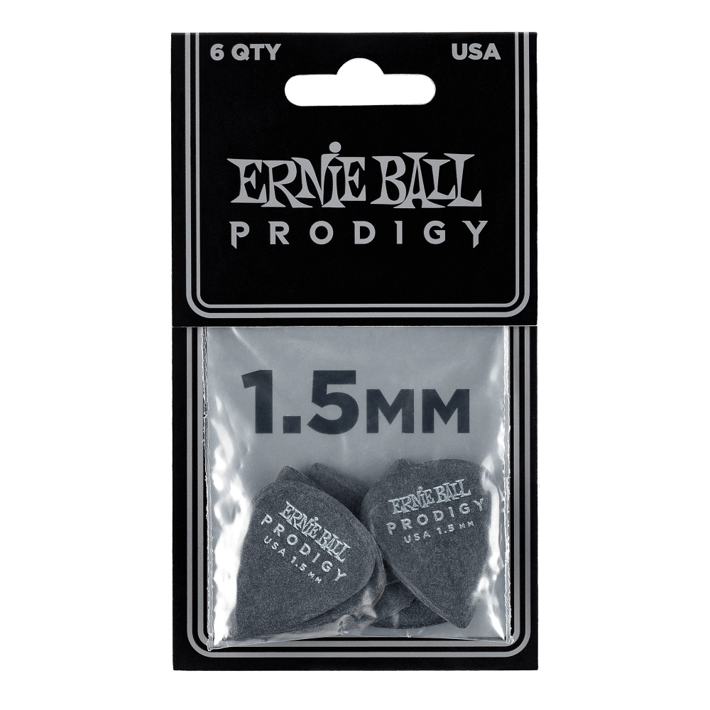 Ernie Ball 9199 Prodigy 1.5MM Black Standard Guitar Picks 6 PackErnie Ball Prodigy picks feature highly durable Delrin material for a more secure non-slip surface. The machined beveled edge and sharp point at bottom allow for less drag, added articulation, and precise control while playing.