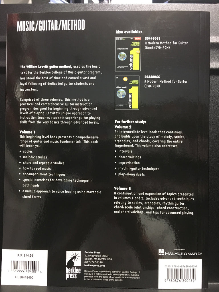 A Modern Method for Guitar Volume 1 Berklee Press HL50449400Discover the incredible world of guitar mastery with A Modern Method for Guitar – Volume 1! Using the same principles taught at the renowned Berklee College of Music, this foundational volume provides a comprehensive journey through guitar and music essentials. Perfect for those just starting out or looking to enhance their skills!Pioneered by renowned musician and educator William Leavitt, this method offers a friendly introduction to guitar-playing, blending essential techniques and music theory basics tailored for new learners. With volume 1, you'll start with the basics: learning how to read notes and understand rhythm to make sense of melodies and songs. Learn the correct way to hold your guitar, position your hands, and use your fingers to create your first sounds. You'll be introduced to simple open chords and easy melodie, empowering you to play along with popular songs from the very start. Designed to lay a strong foundation, volume 1 sets you up for success, ensuring your ready to eventually tackle advanced songs and even improvise with confidence.Let your guitar dreams take flight with Berklee's comprehensive guitar method today!