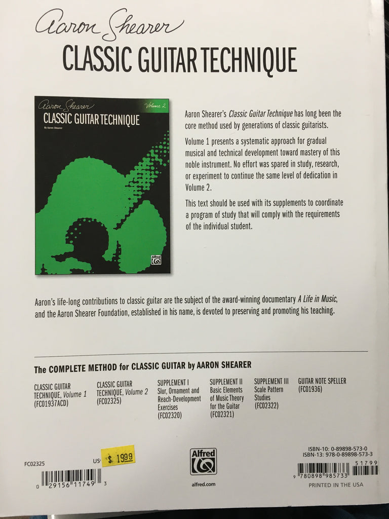 Classic Guitar Technique, Volume 2 by Aaron Shearer Alfred FC02325Volume 1 of Classic Guitar Technique presented a systematic approach for gradual musical and technical development toward mastery of this noble instrument. No effort has been spared in study, research, and experiment to continue the same approach in Volume 2. The full value of these works will be grasped only by those students who are willing to contribute a similar effort on their own part, both in a sympathetic approach to the contents of the books, and a constant evaluation of personal problems which a text by its very nature is unable to consider. This text should be used with its supplements to coordinate a program of study that will comply with the requirements of the individual student. A Federation Festivals 2020-2024 selection.
