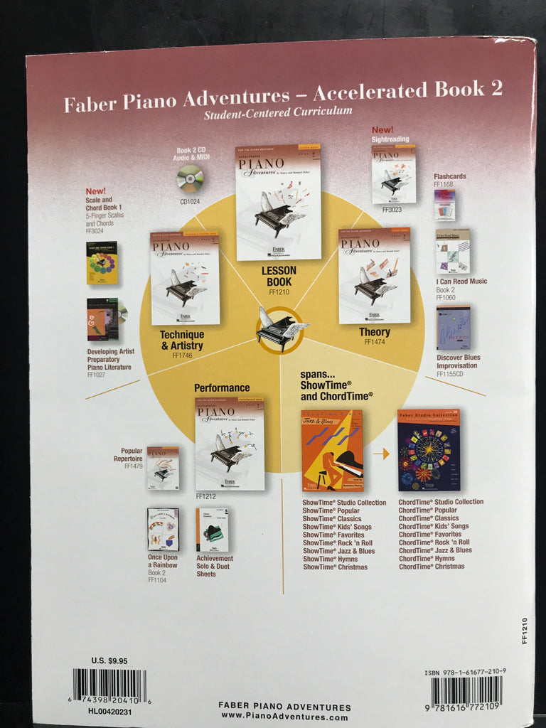Faber Accelerated Piano Adventures for Older Beginner Lesson Book 2 HL00420231Major and minor pentascales; intervals through the 6th; C. G, and F major scales. Contents include: Almost Like a Dream - America - American Fiddle Tune - Beach Party - Beethoven's Fifth Symphony Theme - Blues Train - The Boogie Machine - Brahms' Lullaby - Can-Can - Cathedral Chimes - Chord Jumps - Classical Dance - Cross-Hand Arpeggios - El Matado.