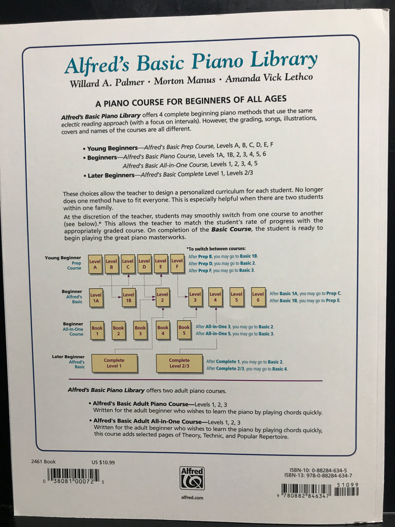 Alfred’s Basic Adult Piano Course Lesson Book 2This book begins with an extensive review of the chords and keys previously studied, using fresh and interesting material that will provide enjoyment as well as reinforcement. Particularly noteworthy is the systematic presentation of chords in all positions in both hands. Titles: America the Beautiful * Arkansas Traveler * The Battle Hymn of the Republic * Black is the Color of My True Love's Hair * Brahms Lullaby * Canon in D (Pachelbel) * Deep River * Down in the Valley * Farewell to Thee (Aloha Oe) * Fascination * A Festive Rondeau * Frankie and Johnnie * The Hokey-Pokey * The House of the Rising Sun * Introduction and Dance * La Cucaracha * La Donna E Mobile * La Raspa * Light and Blue * Loch Lomond * Lonesome Road * The Marriage of Figaro * Morning Has Broken * Musetta's Waltz * Musette * Night Song * Nobody Knows the Trouble I've Seen * Polyvetsian Dances * Pomp and Circumstance No. 1 * The Riddle * Rock-a My Soul * Roman Holiday * Sakura * Scherzo * Space Shuttle Blues * Swingin' Sevenths * Theme from Symphony No. 6 (Tchaikovsky) * Tumbalalaika * Village Dance * Waves of the Danube * When Johnny Comes Marching Home * You're in My Heart.