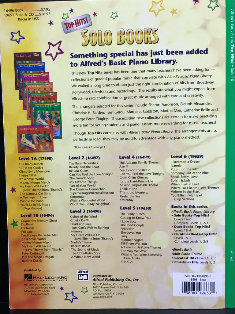 Alfred’s Basic Piano Library Top Hits! Solo Book Level 1B 16496Alfred's Top Hits series has overwhelmingly been accepted by students and teachers. This series combines just the right combination of hits from Broadway, Hollywood, television and recordings! As you might expect from Alfred, this series offers a rare combination of great music arranged with care and creativity. Your beginning and intermediate students can savor the excitement of playing pop music and reap the benefits from making practicing more fun and rewarding. Titles: Casper the Friendly Ghost * Do-Re-Mi * Edelweiss * I'm Late * I'm Popeye the Sailor Man * It's a Small World * Mickey Mouse March * My Heart Will Go On * Peter Cottontail * Puff the Magic Dragon * Rubber Duckie.