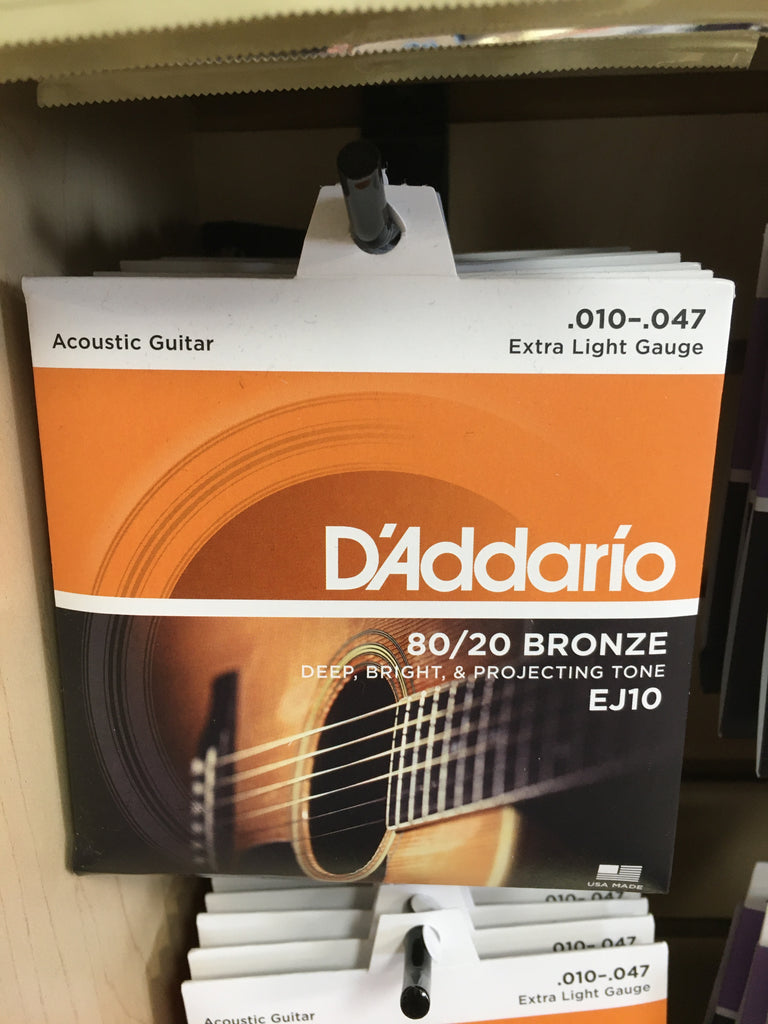 D’Addario EJ10 Extra Light 80/20 Bronze Acoustic Guitar Strings 10-47EJ10 is an extra light gauge 80/20 Bronze set providing lower tension ideal for vintage instruments and playability. 80/20 Bronze, the original acoustic alloy introduced by John D'Addario Sr. and John D'Angelico in the 1930s is a popular alloy for recording due to their crisp, deep and projecting tone and appeal to many traditionalists and vintage enthusiasts for their historical significance.EJ10 Extra Light.010 .014 .023 .030 .039 .047