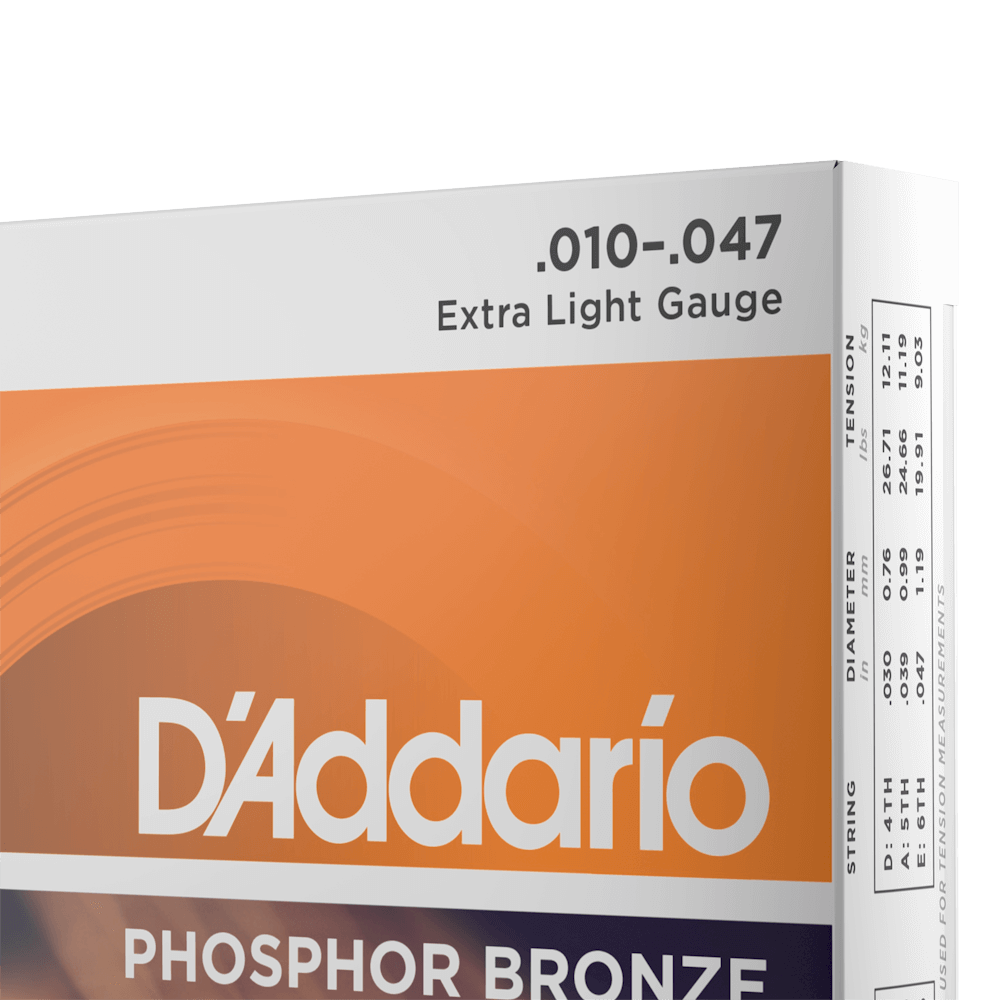 D’Addario EJ15 Extra Light Phosphor Bronze Acoustic Guitar Strings 10-47D'Addario was the first to use Phosphor Bronze in acoustic guitar strings back in 1974. Today, Phosphor Bronze is played throughout the world and considered to be the standard in acoustic strings, thanks to its beautiful sonic balance and tonal warmth. Our pioneering Phosphor Bronze acoustic guitar strings are precision wound with phosphor bronze wrap wire over a high-carbon steel core, providing tonal versatility suitable for all acoustic styles and musical genres. These 10-47 Extra Light gauge strings are easy to play and easy to bend.Phosphor Bronze was introduced to string making by D'Addario in 1974 and has become synonymous with warm, bright, and well balanced acoustic tone. D'Addario Phosphor Bronze strings are precision wound with corrosion resistant phosphor bronze onto a carefully drawn, hexagonally shaped, high carbon steel core. The result is long lasting, bright sounding tone with excellent intonation.