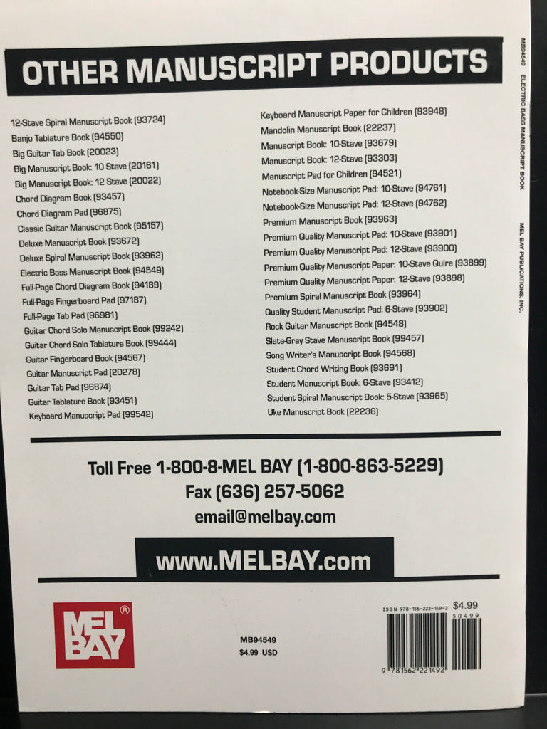 Electric Bass Manuscript Book Mel Bay MB94549A premium-quality electric bass tablature book with tear-out sheets. Each page contains joint staves--the top for writing music in notation; the bottom for writing music in tablature. Blank chord grids are at the bottom of each page.