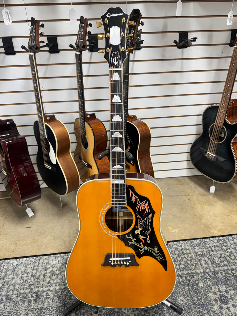 The Epiphone Masterbilt Excellente delivers professional-grade craftsmanship in a stunning Antique Natural finish. This acoustic guitar features a solid spruce top paired with mahogany back and sides, producing warm, resonant tones ideal for fingerstyle and strumming alike. The comfortable mahogany neck and rosewood fingerboard ensure smooth playability, while quality hardware and precise construction reflect Epiphone's commitment to excellence. Perfect for intermediate to advanced players seeking premium tone and aesthetics without the premium price tag.