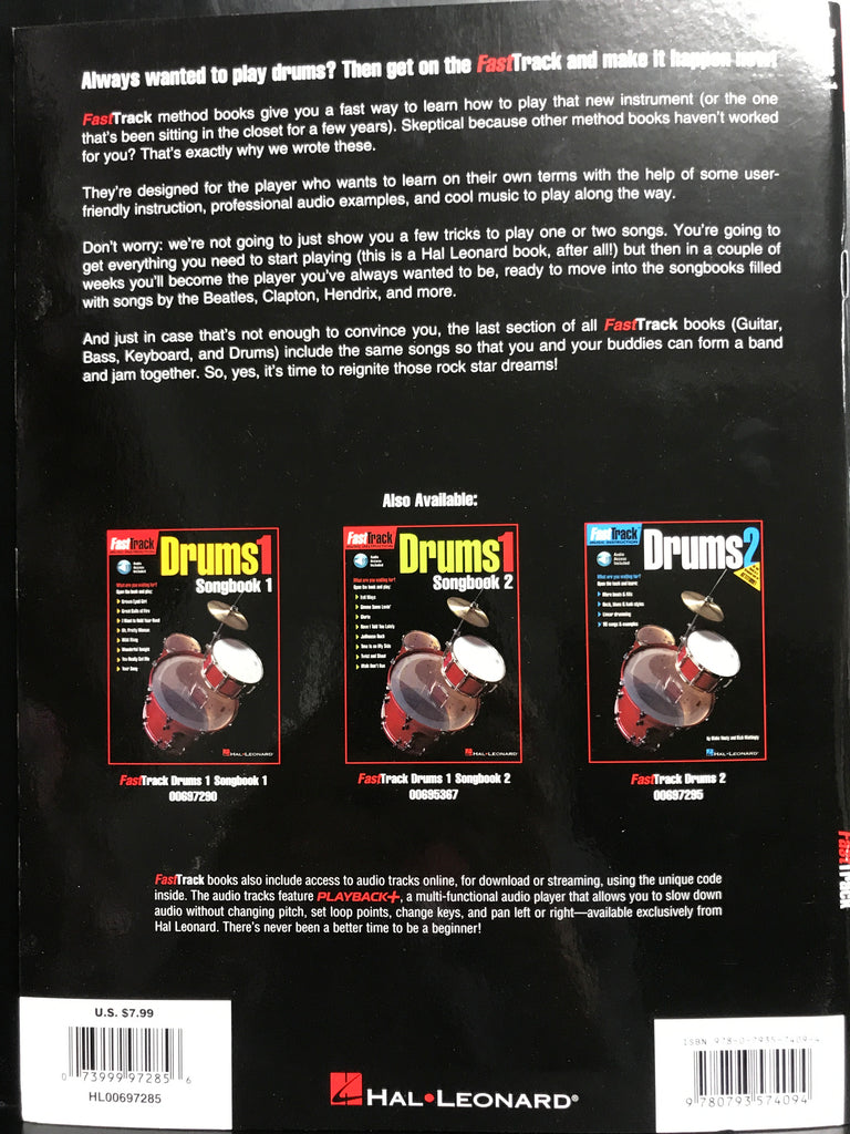 FastTrack Drums Method Book 1 HL00697285The FastTrack method series is a fresh, user-friendly approach to learning with a method book which blends traditional lessons and songs with modern elements of humor, wit, and pop culture. Each book includes play-along tracks accessed online for download or streaming plus songs that are the same in all the FastTrack books so that friends can form a band and jam together.Hal Leonard Fast Track Drums 1