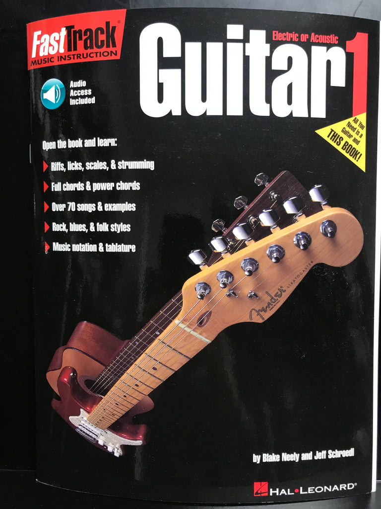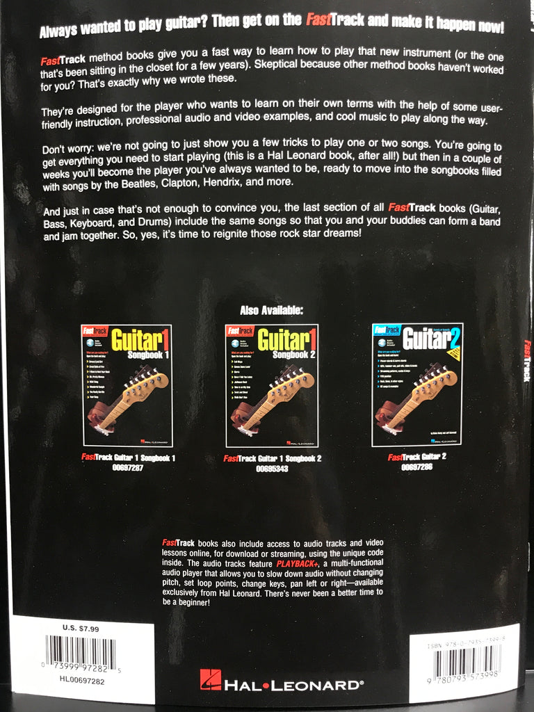 FastTrack Guitar Method Book 1 HL00697282For electric or acoustic guitar - or both! Teaches music notation, tablature, Full chords and power chords, riffs, licks, and scales, and rock and blues styles. Method Book 1 includes 73 songs and examples.