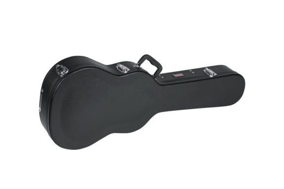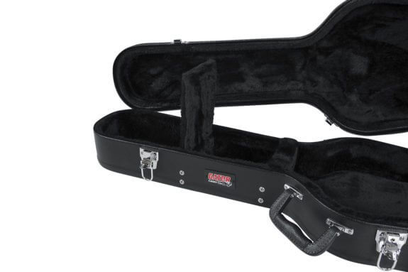 Gator GWE-LPS-BLK Les Paul Guitar Wood CaseHard-Shell Wood Case for Single-Cutaway Guitars such as Gibson Les Paul®The GWE-LPS-BLK Hard-Shell Wood Case for Single-Cutaway Guitars such as Gibson Les Paul is lightweight, ultra-slim, and designed to protect against the minor bumps and bruises of daily use. Ultra-durable plywood coated in black Tolex PVC forms a moisture-resistant, impact-resistant outer barrier while plush fabric lining keeps your single-cutaway guitar stable. The large interior storage compartment fits everything from straps and tuners to picks and capos. Chrome plated lockable latches form a secure enclosure and the ergonomic carrying handle perfectly balances the case's weight and gives you a comfy grip on your gear. Keep your Gibson Les Paul guitar safe and sound with the Gator GWE-LPS-BLK hard-shell wood case.