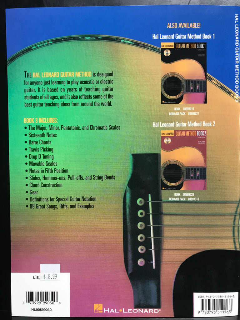 Hal Leonard Guitar Method Book 3 NO CD HL00699030Book 3 covers: the major, minor, pentatonic and chromatic scales, sixteenth notes; barre chords; drop D tuning; movable scales; notes in fifth position; slides, hammer-ons, pull-offs and string bends; chord construction; gear; great songs, riffs & examples; and more!