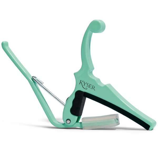 Kyser KGEFSGA Surf Green Electric Guitar Capo Quick-ChangeTwo legendary brands. Four legendary finishes. Kyser&174; Musical Products, Inc. has collaborated with Fender&174; Musical Instruments Corp. to launch its new series of "Classic Colors" Quick-Change&174; Electric Guitar Capos. The capos feature Kyser's precision ColorMatch Process&153;along with a newly designed 9.5" radius that has been engineered against numerous fretboards from several electric guitar models to guarantee accurate tension and fit.