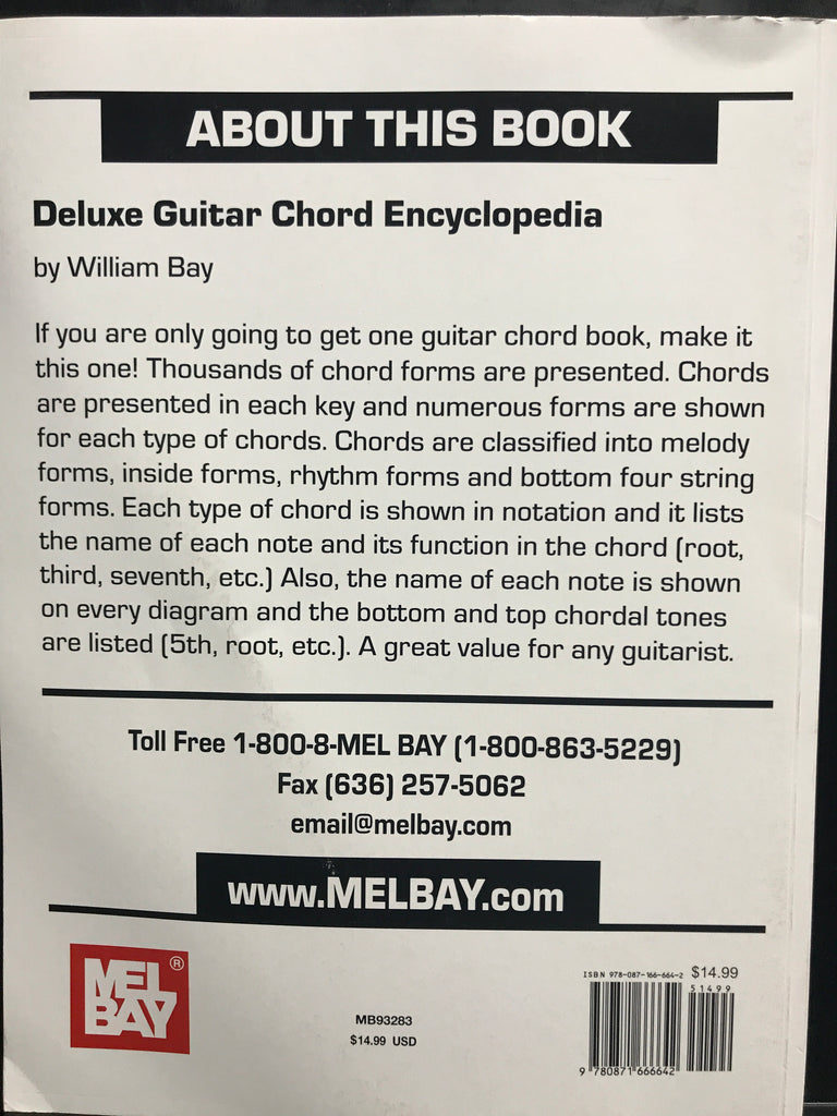 Mel Bay Deluxe Guitar Chord Encylopedia Book MB93283If you are only going to get one guitar chord book, make it this one! Thousands of chord forms are presented. Chords are presented in each key and numerous forms are shown for each type of chords. Chords are classified into melody forms, inside forms, rhythm forms and bottom four string forms. Each type of chord is shown in notation and it lists the name of each note and its function in the chord (root, third, seventh, etc.) Also, the name of each note is shown on every diagram and the bottom and top chordal tones are listed (5th, root, etc.). A great value for any guitarist.