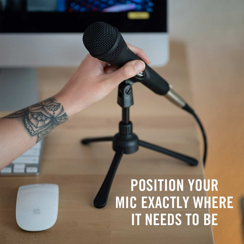 Be heard clearly and professionally! Get your microphone exactly where you need it. Your remote conferencing, recording and podcasting takes the next step up with this lightweight, folding Desktop Mic Stand. The clip is compatible with most popular hand-held microphones and the non-skid rubber feet minimize surface noise. Compact and easily stored when not in use.Features