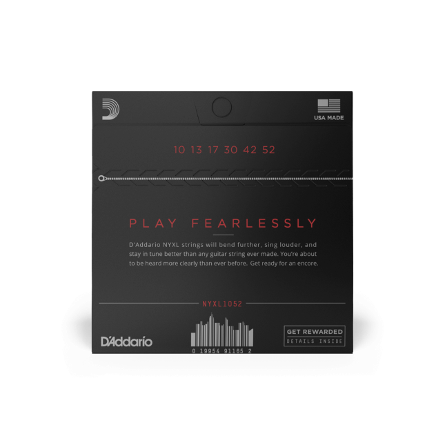 D’Addario NYXL1052 Light Top/Heavy Bottom Nickel Wound Electric Guitar Strings 10-52NYXL's will bend farther, sing louder, and stay in tune better than any string you've played before. As our premium uncoated electric string, NYXLs offer higher break strength, enhanced tuning stability, and accentuated mid-range frequency response, providing more presence and crunch to cut through the mix. Made with a NY Steel core, premium nickel-plated steel wrap wire, and Fusion Twist technology, NYXL electric guitar strings are tough enough and versatile enough to handle anything. 10-52 Light Top/Heavy Bottom gauge strings have a deeper low-end than Regular Lights, balanced with comfortable playability.D'Addario NYXL guitar strings will bend further, sing louder, and stay in tune better than any string you've played before. Envisioned, perfected, and manufactured by D'Addario in New York, this newly engineered, break-resistant, high-carbon steel core and plain steel alloy delivers a whole new level of freedom, confidence, and power. NYXL's provide more strength and up to 131% greater tuning stability by utilizing a completely reinvented wire drawing process coupled with a revolutionary "fusion twist" process for the plain steels. The reformulated nickel plated string windings have greater magnetic properties resulting in higher output and enhanced mid-range frequency response for more presence and crunch.