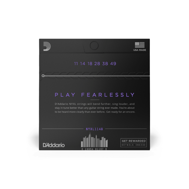 D’Addario NYXL1149 Medium Electric Guitar Strings 11-49NYXL's will bend farther, sing louder, and stay in tune better than any string you've played before. As our premium uncoated electric string, NYXLs offer higher break strength, enhanced tuning stability, and accentuated mid-range frequency response, providing more presence and crunch to cut through the mix. Made with a NY Steel core, premium nickel-plated steel wrap wire, and Fusion Twist technology, NYXL electric guitar strings are tough enough and versatile enough to handle anything. 11-49 Medium gauge strings provide increased volume, with slightly more tension and resistance.D'Addario NYXL guitar strings will bend further, sing louder, and stay in tune better than any string you've played before. Envisioned, perfected, and manufactured by D'Addario in New York, this newly engineered, break-resistant, high-carbon steel core and plain steel alloy delivers a whole new level of freedom, confidence, and power. NYXL's provide more strength and up to 131% greater tuning stability by utilizing a completely reinvented wire drawing process coupled with a revolutionary "fusion twist" process for the plain steels. The reformulated nickel plated string windings have greater magnetic properties resulting in higher output and enhanced mid-range frequency response for more presence and crunch.
