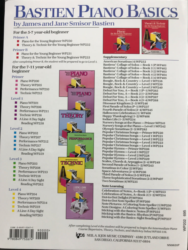 Bastien Piano Basics Piano Book Level 2 WP202Piano is the main lesson book in the Bastien Piano Basics course. The carefully graded, logical learning sequence assures steady, continual progress. Original music by the Bastiens includes a stimulating mixture of pop, folk, classical, and contemporary styles. Full-color illustrations throughout entertain and reinforce musical concepts along the way. The gradual multi-key approach takes students through all 12 keys -- 3 in each of Levels 1, 2, 3, and 4. Each page is carefully correlated page-by-page with Theory, Performance, and Technic. All in all, a dynamic way to introduce students to the marvelous world of music!