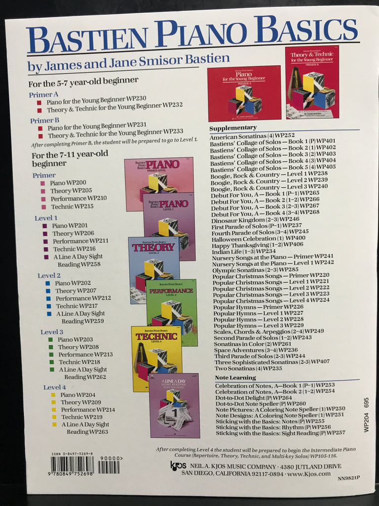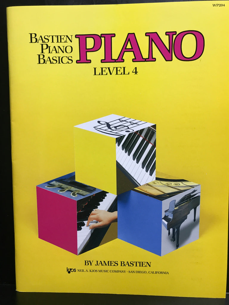 Bastien Piano Basics Piano Level 4 WP204Piano is the main lesson book in the Bastien Piano Basics course. The carefully graded, logical learning sequence assures steady, continual progress. Original music by the Bastiens includes a stimulating mixture of pop, folk, classical, and contemporary styles. Full-color illustrations throughout entertain and reinforce musical concepts along the way. The gradual multi-key approach takes students through all 12 keys -- 3 in each of Levels 1, 2, 3, and 4. Each page is carefully correlated page-by-page with Theory, Performance, and Technic. All in all, a dynamic way to introduce students to the marvelous world of music!Level 4 presents the overlapping pedal, 1st and 2nd inversion triads, sixteenth notes, dotted eigth notes, altered intervals, augmented and diminished triads, syncopation, parallel major and minor scales, grace notes, and the keys of G-flat, B-flat, and B