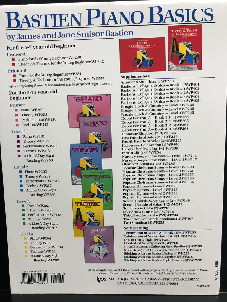 Bastien Piano Basics Piano Primer Level WP200Piano is the main lesson book in the Bastien Piano Basics course. The carefully graded, logical learning sequence assures steady, continual progress. Original music by the Bastiens includes a stimulating mixture of pop, folk, classical, and contemporary styles. Full-color illustrations throughout entertain and reinforce musical concepts along the way. The gradual multi-key approach takes students through all 12 keys -- 3 in each of Levels 1, 2, 3, and 4. Each page is carefully correlated page-by-page with Theory, Performance, and Technic. All in all, a dynamic way to introduce students to the marvelous world of music!