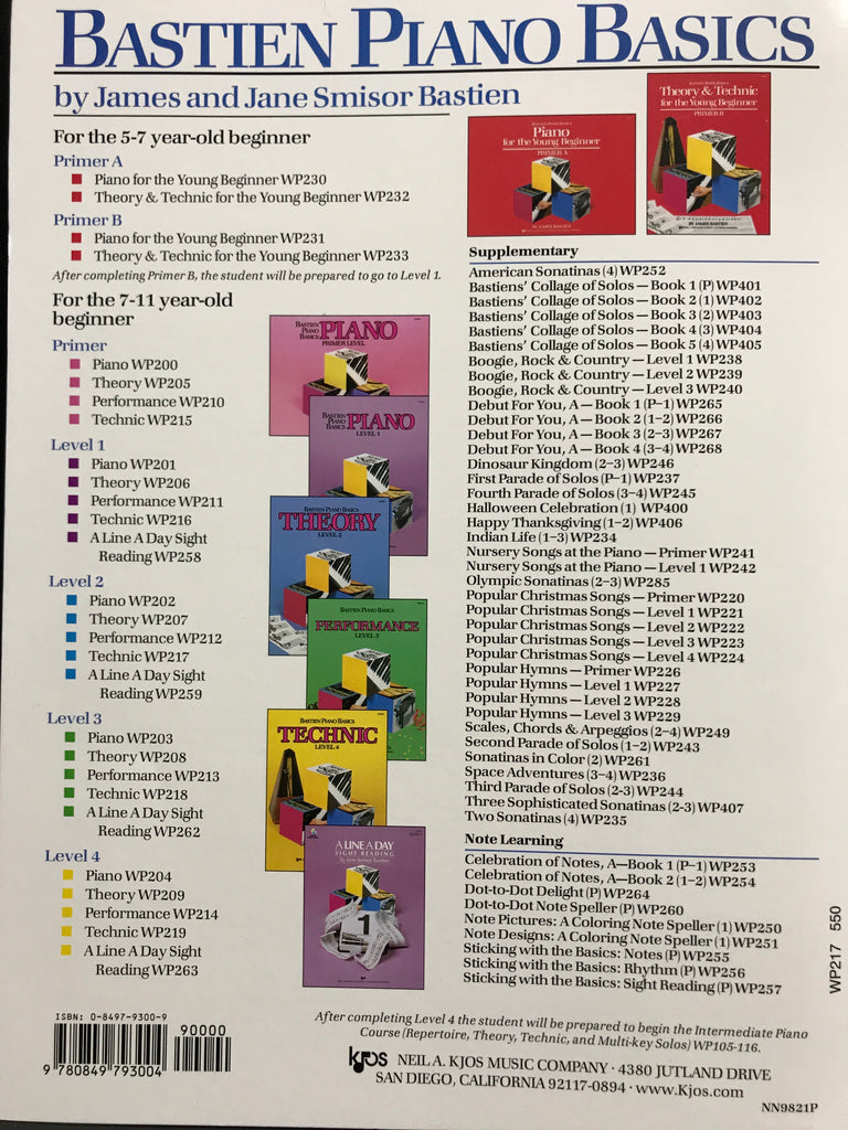 Bastien Piano Basics Technic Book Level 2 WP217Technic is the Bastien Piano Basics technic development series. Use the practical warm-up exercises to start lessons and practice sessions. Original works by James Bastien, and graded etudes by masters such as Schmitt, Czerny, Hanon, and Lemoine reinforce technic. Each page is carefully correlated with Piano, Performance,and Theory. Your students will develop dependable technic from the very beginning.