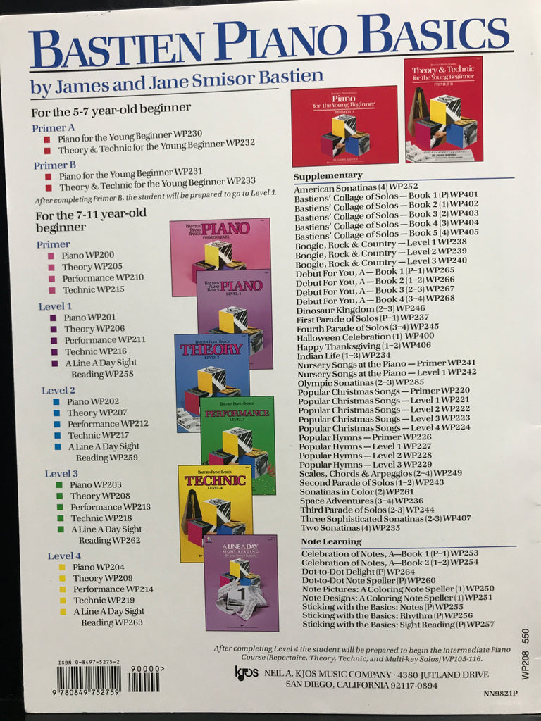 Bastien Piano Basics Theory Level 3 WP208Theory is the theory workbook portion of the Bastien Piano Basics course. Each book contains written work and some short pieces to reinforce the concepts presented in Piano. Games, puzzles, and colorful illustrations make learning fun! Your students will gain a better understanding of the music they are playing, and they will learn more easily when theory instruction is a regular part of their piano studies. Each page is carefully correlated with Piano, Performance, and Technic.