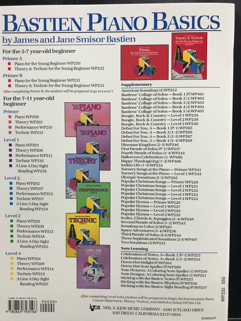Bastien Theory & Technic for the Young Beginner Primer A WP232This series is designed to be used in conjunction with Piano for the Young Beginner, Primers A and B. Short pieces, written exercises, and technic studies are used to emphasize and reinforce concepts.The Primer A Level is a collection of short pieces, written exercises, and technical studies emphasizing the ideas presented in Piano.
