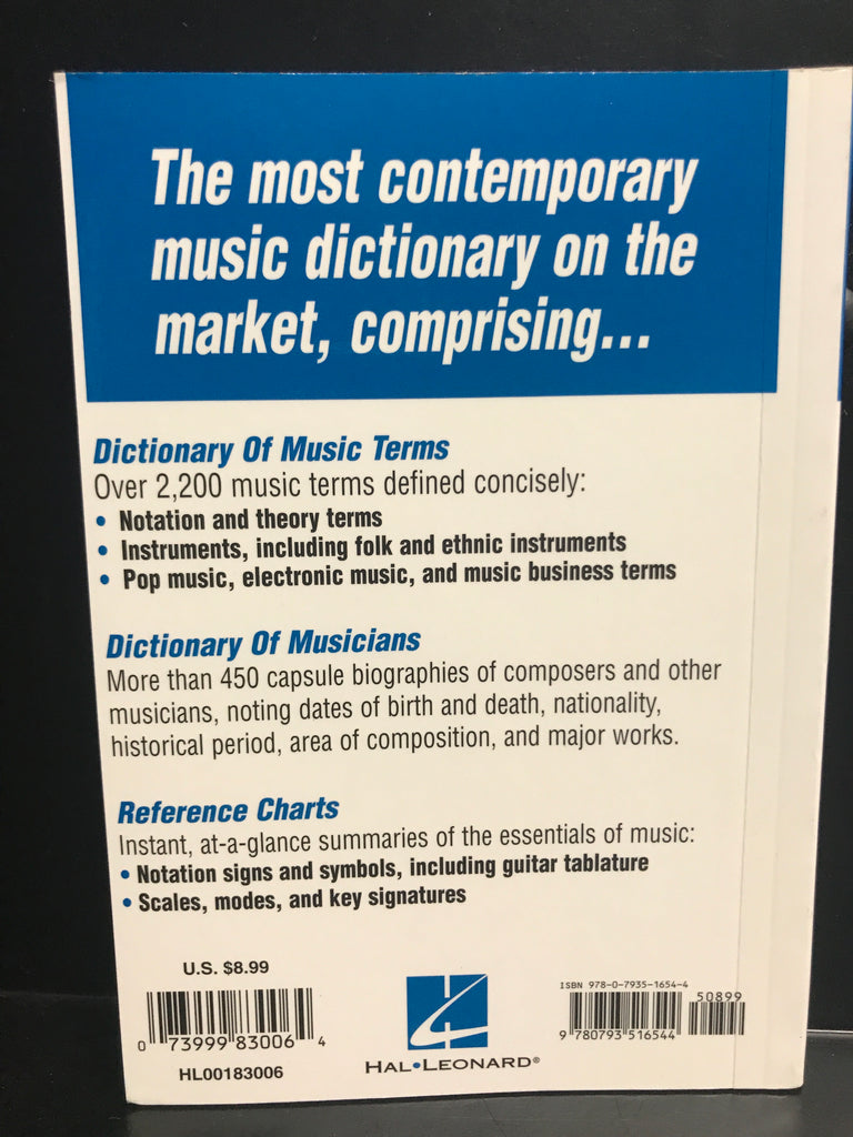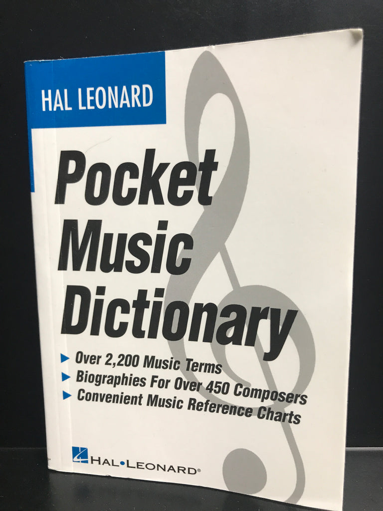 Hal Leonard Pocket Music Dictionary HL00183006Here's the most contemporary music dictionary on the market! Conveniently divided into three main sections: The Dictionary of Music Terms defines over 2,000 music terms concisely, including notation and theory terms, instruments and terms used in pop music, electronic music and the music business; The Dictionary of Musicians provides more than 400 capsule biographies of composers and other musicians; and Reference Charts give instant, at-a-glance summaries of the essentials of music, encompassing instrumental and vocal ranges, notation signs and symbols, and scales, modes and key signatures.
