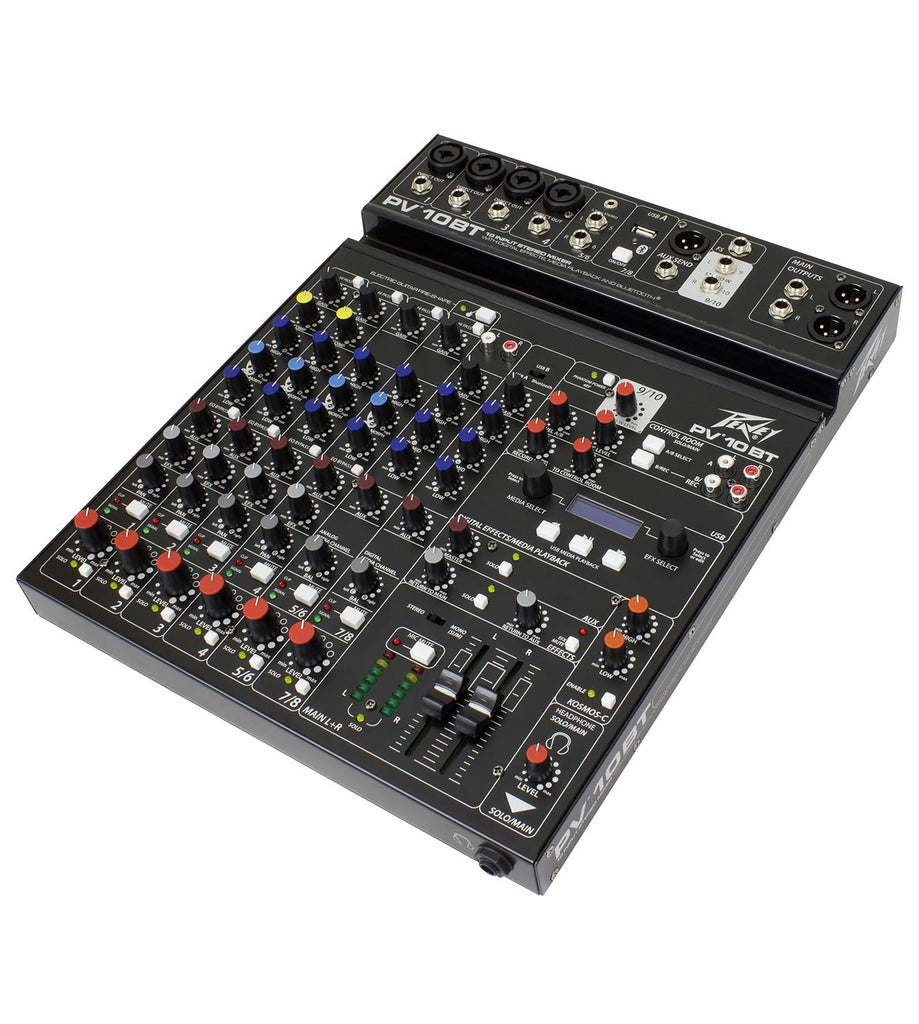 The PV 10 BT includes 4 channels of reference quality mic preamps, 4 direct outputs for recording, a stereo channel, media channel with Bluetooth wireless input, high quality digital effects with LCD display, streaming USB out, MP3 playback via USB A input, Peavey's exclusive Kosmos audio enhancement, 48-volt phantom power, dual selectable control room outputs, 2 channels of compression, one channel of on board selectable guitar preamp, 3-band EQ per channel with bypass, channel mute buttons, aux send, signal clip indicators, and a stereo master LED meter bridge. This amazingly versatile mixer is at home both in the studio as well as live applications.