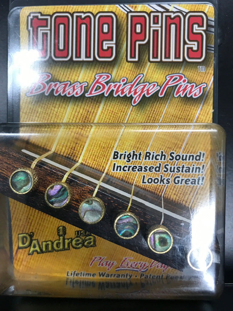 D’Andrea TP2A Tone Pins Brass Abalone for Acoustic Guitar BridgesD'Andrea USA’s Tone Pins are machined out of brass and fit almost all brands of six string acoustic guitars. By adding mass to the bridge, tone pins increase the clarity, sustain, and brightness of your overall tone. Various styles as well as inlay options will complement any instrument.