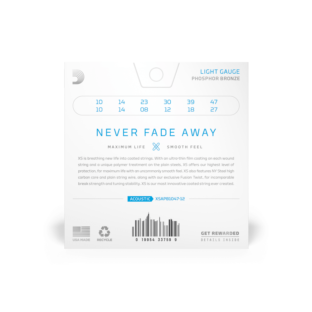 D’Addario XSAPB1047-12 XS Light Coated 12 String Phosphor Bronze Acoustic Guitar Strings 10-47Born from our greatest breakthrough in string innovation, XS Phosphor Bronze strings have the longest life of any D'Addario acoustic guitar string. The XS coating gives our warm, balanced phosphor bronze strings maximum life, with an uncommonly smooth feel. Made with a NY Steel core, phosphor bronze wrap wire and Fusion Twist technology, XS coated acoustic guitar strings have incomparable break strength and tuning stability, in addition to their dramatically increased lifespan. This 10-47 Light gauge 12-string set is great for 12-string acoustic guitars.