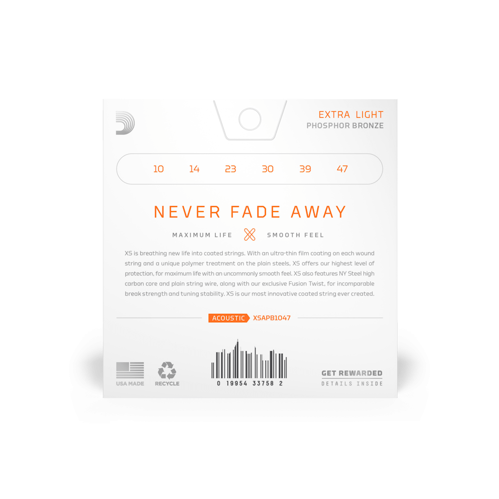 D’Addario XSAPB1047 XS Extra Light Coated Phosphor Bronze Acoustic Guitar Strings 10-47Born from our greatest breakthrough in string innovation, XS Phosphor Bronze strings have the longest life of any D'Addario acoustic guitar string. The XS coating gives our warm, balanced phosphor bronze strings maximum life, with an uncommonly smooth feel. Made with a NY Steel core, phosphor bronze wrap wire and Fusion Twist technology, XS coated acoustic guitar strings have incomparable break strength and tuning stability, in addition to their dramatically increased lifespan. These 10-47 Extra Light gauge XS strings are easy to play and easy to bend.