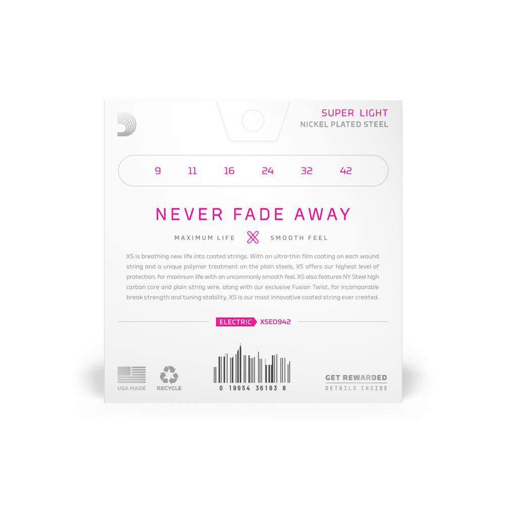 D’Addario XSE0942 XS Nickel Coated Super Light 9-42 Electric Guitar StringsXS Nickel coated electric guitar strings provide the longest life of any D'Addario electric guitar string. Coated with our groundbreaking XS coating, these premium electric strings attain maximum life and a smooth, fast feel without dampening their outstanding tone. Constructed with a NY Steel core, reformulated nickel-plated steel wrap wire, and Fusion Twist technology, XS Nickel strings boast superior strength and tuning stability, plus richer harmonics, greater clarity, and remarkable definition with every sweep, slide, and bend. This 9-42 Super Light gauge set is easy to bend and very flexible.